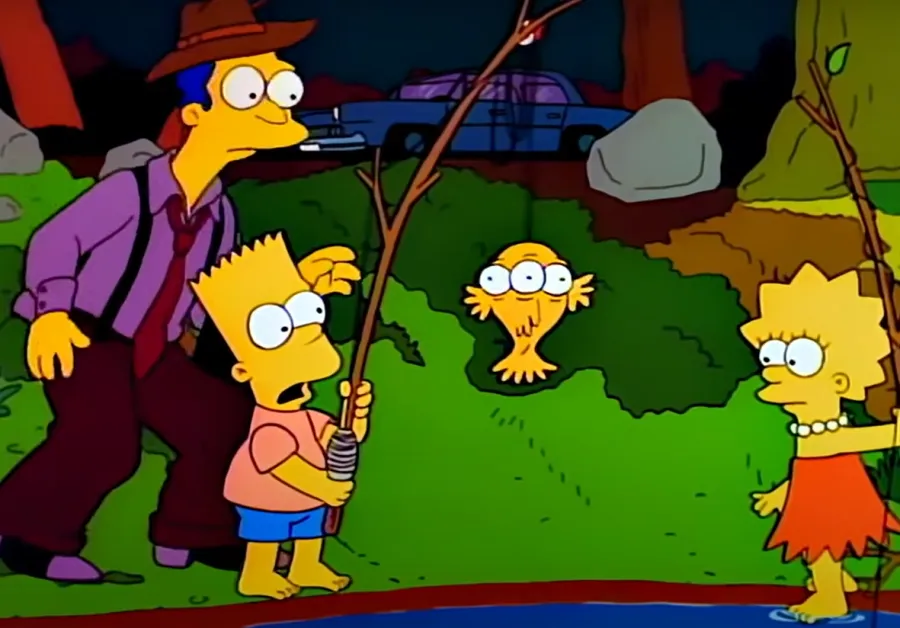 Это было из 2-го сезона 4-го эпизода шоу, где Барт ловит трехглазую рыбу Блинки в реке рядом с электростанцией. Позже, это попадает в местные заголовки.