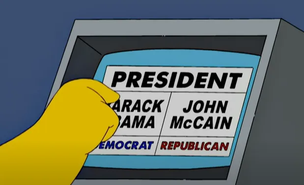 В 20-й серии 4-го сезона в 2008 году Гомер Симпсон пытался проголосовать за Барака Обаму на выборах в США, но неисправная машина изменила его голос.